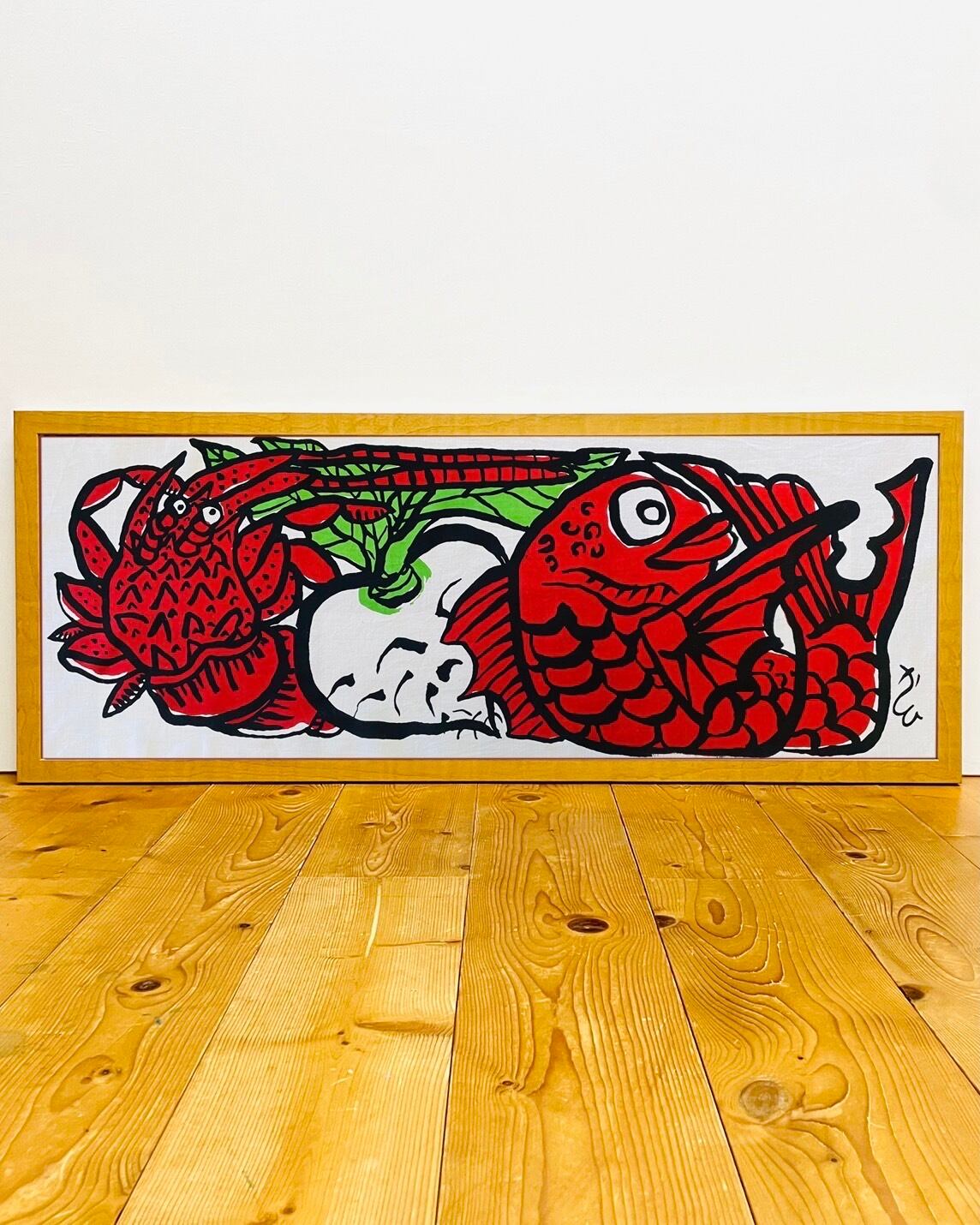 日本で古くから縁起の良いとされるモチーフ、鯛・蕪・海老を大胆なタッチで描いた手ぬぐいです。