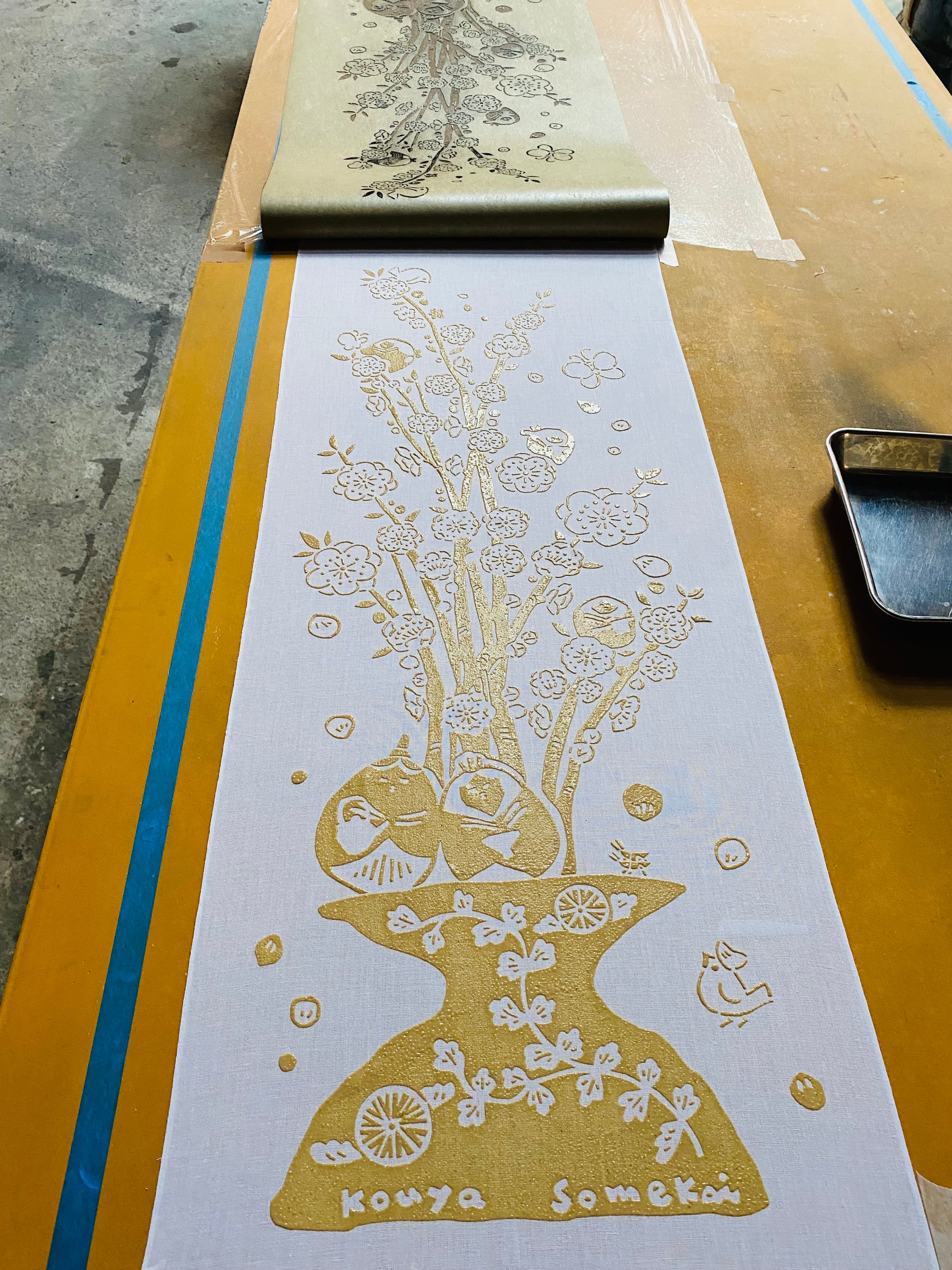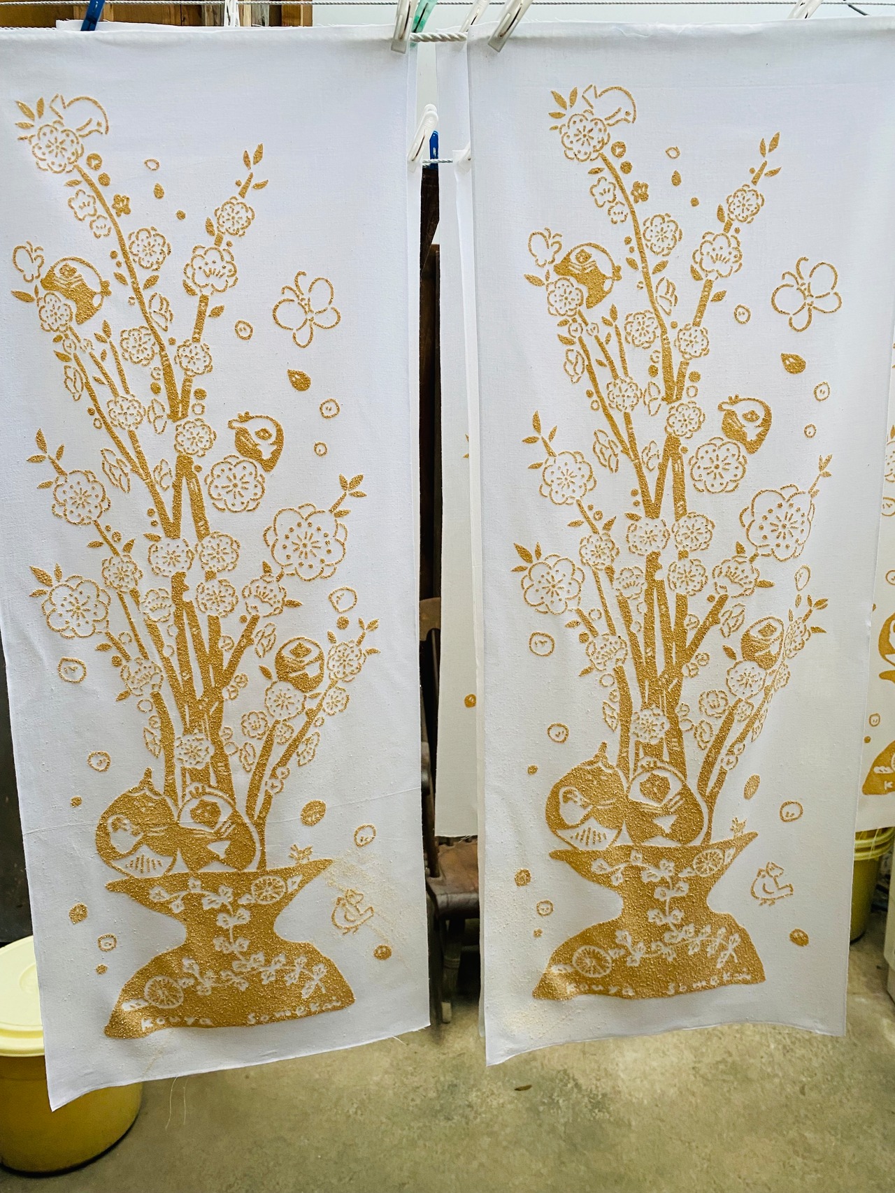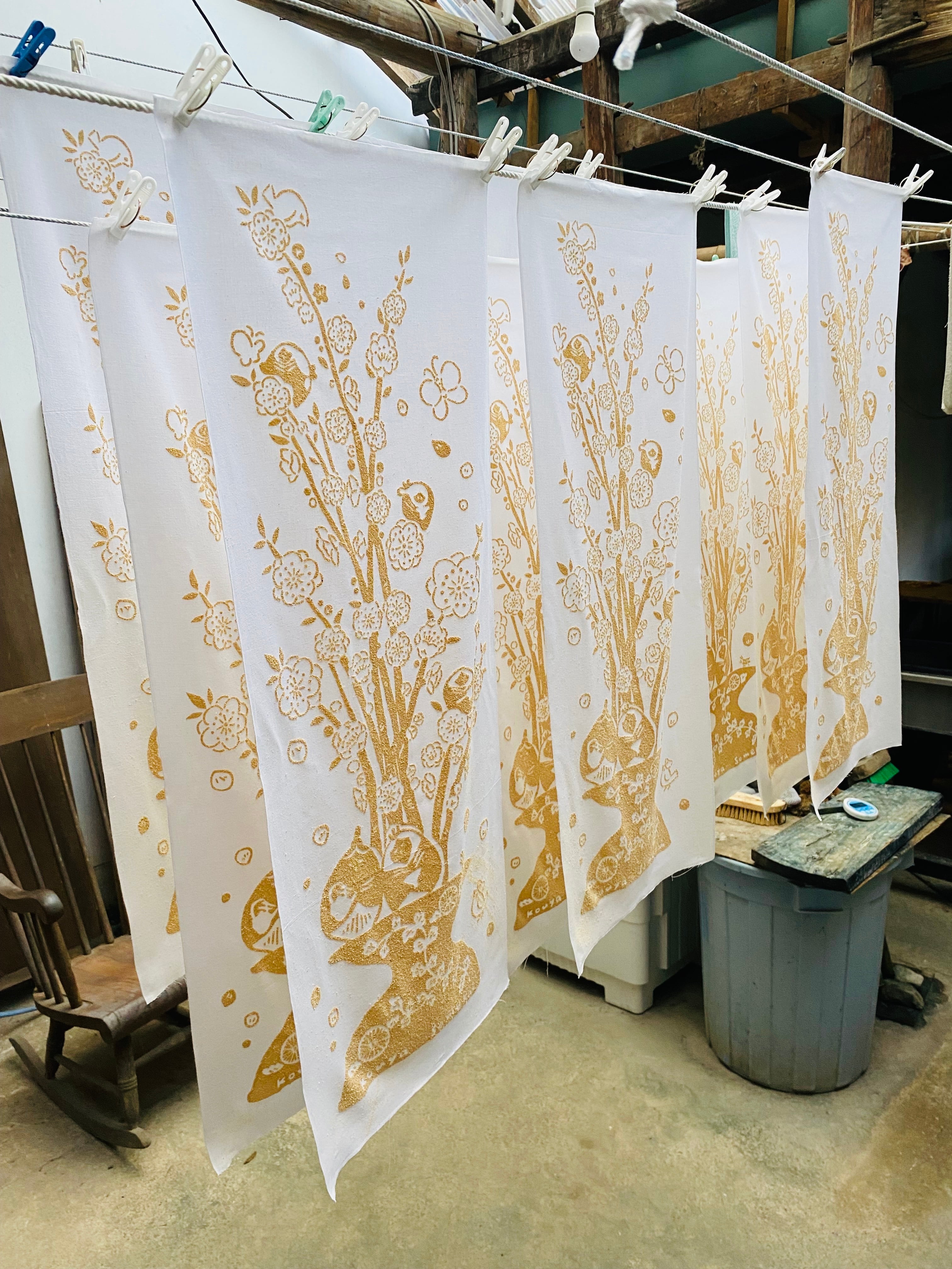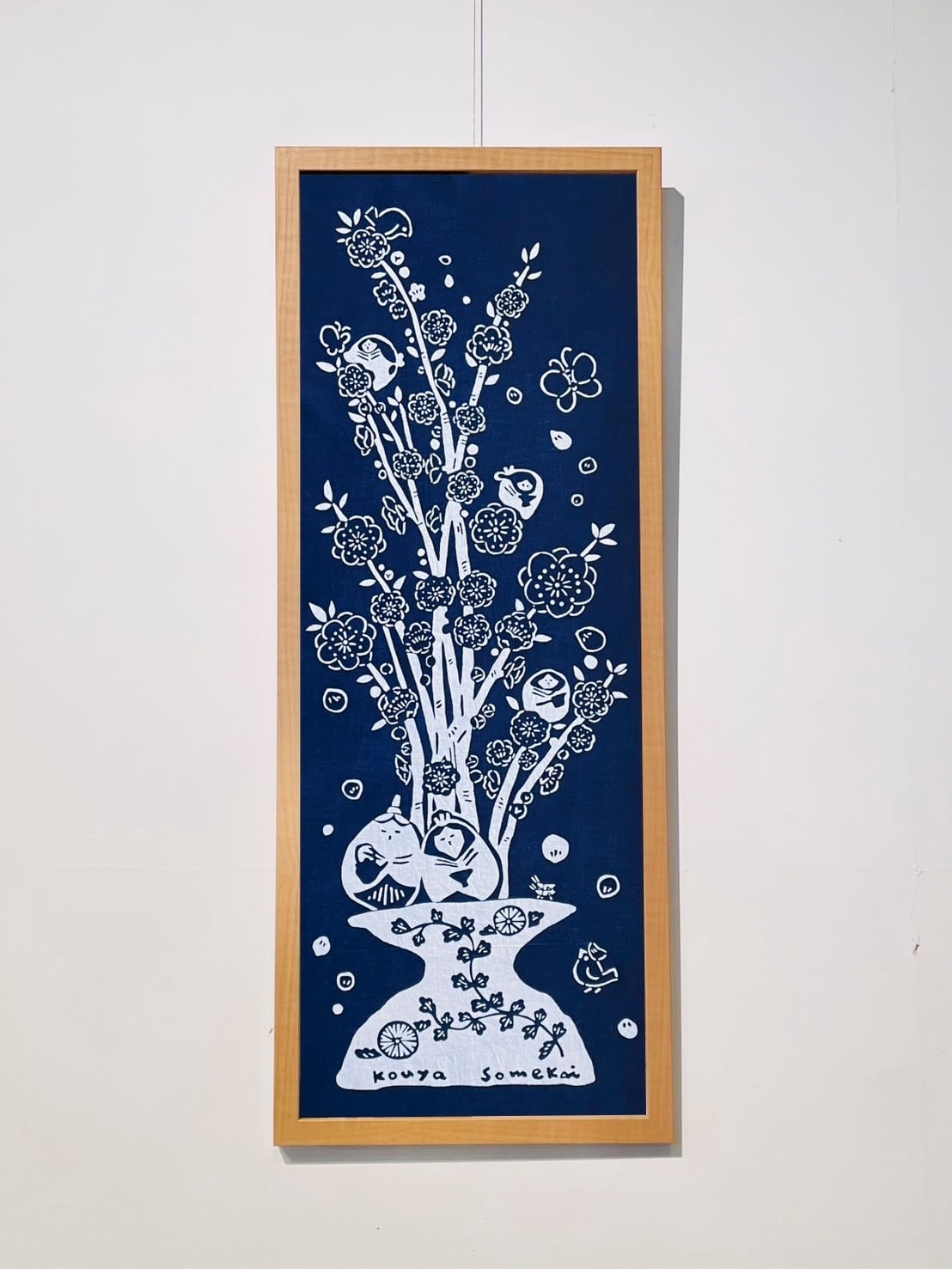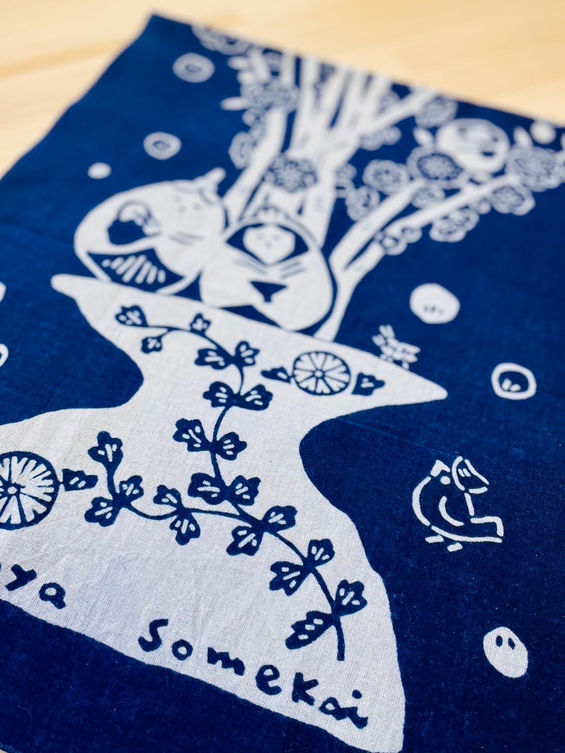 In addition to daily use as a tenugui, it can be worn around the neck as a neckerchief, as a table center, as a curtain (two pieces strung together), or as a framed piece of interior decoration.