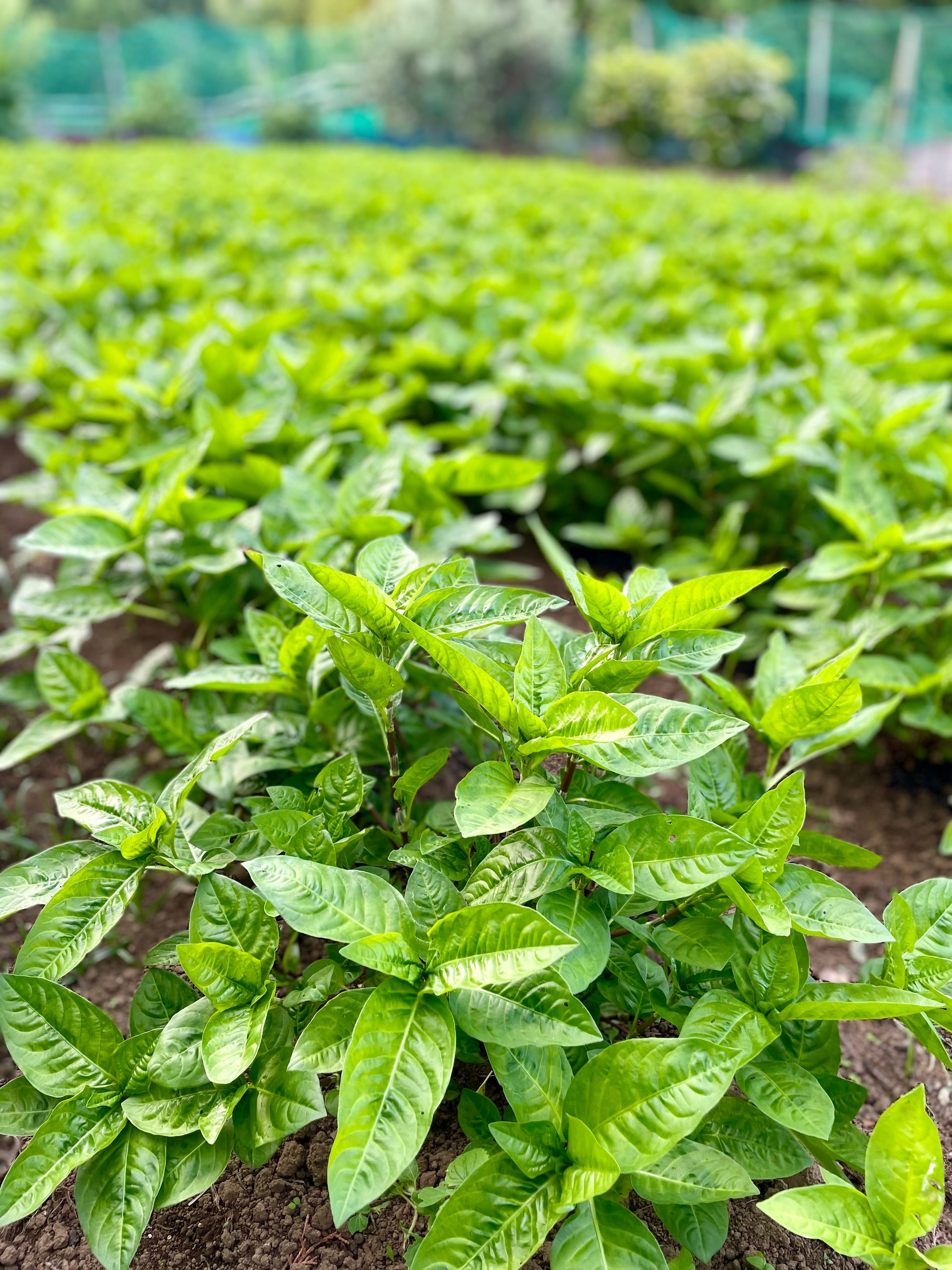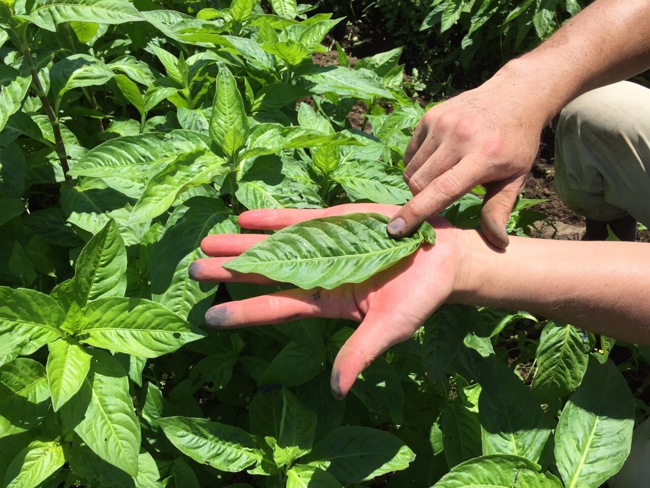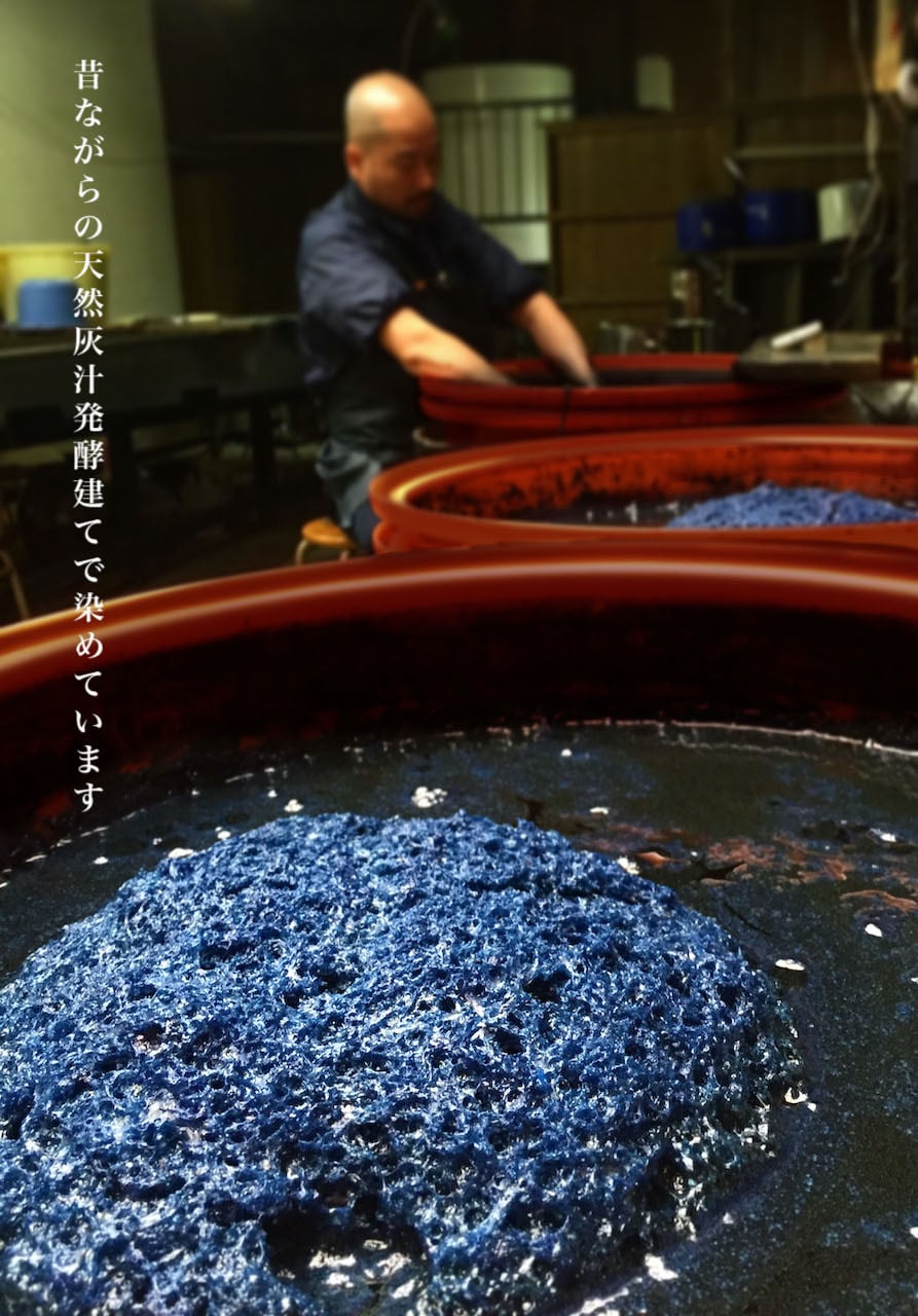 清涼な空気と水のある故郷、九州は大分県竹田市の畑で農薬を使わず有機肥料を与えながら自分たちで育てています。毎年収穫した葉を蒅にして、昔ながらの「天然灰汁発酵建」で一点一点心を込めて藍染をしています。