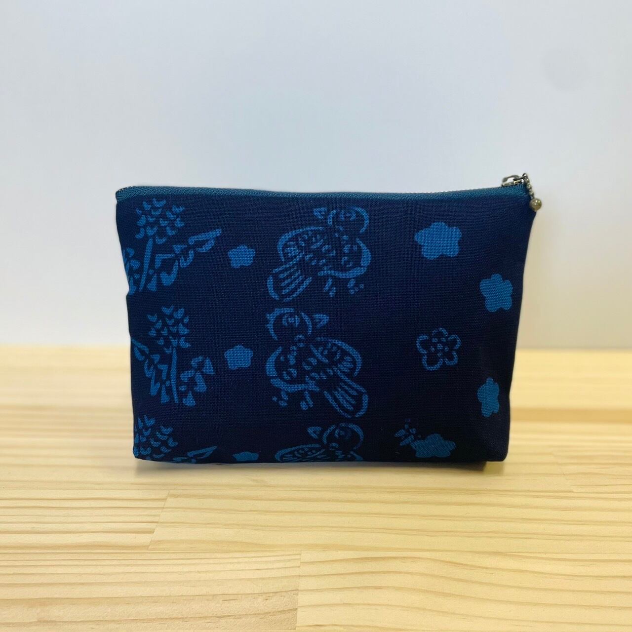 藍と型染のフラットポーチ【椿と鳥】